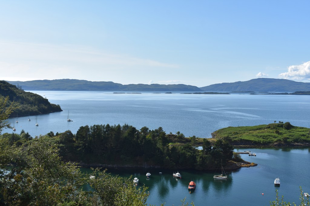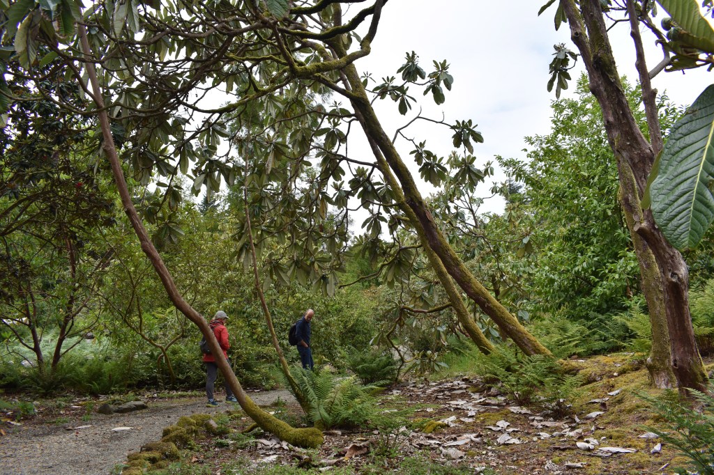One day we spent a lovely afternoon visiting Arduaine, a NTS garden on a small peninsular not far to the north of Crinan. This is a grand garden with an important collection of rhododendrons. The garden was started by James Arthur Campbell in 1898 and continued by his son, Bruce, and other members of the family. By the time James Arthur died there were over 220 different kinds of rhododendrons growing at Arduanie. Eventually the garden was sold to the Wright brothers, Edmund and Harry, who added to the rhododendron collection and finally gave it to the Trust in 1992. So different from Crathes, but with some issues in common. I was interested to see a lot of skunk cabbage and asked a gardener about it. He explained that they could only keep on top of it by cutting the flowering heads (as in the Coy Burn at Crathes). Because the garden drained into a sea loch, it was unlikely to be infecting other properties. More problematic was the Phytophthora ramorum, a pathogen that has done immense damage across Britain and in other NTS gardens, especially on the west coast. The Phytophthora had infected the larch which had to be felled. This meant that when Storm Arwen hit Arduaine the shelter belt had been removed and storm damage was much heavier than anticipated. Rebecca, the apprentice at Arduaine was on the same course as Emily at Crathes. They spent ten weeks of their two year apprenticeship at college in Edinburgh and are now moving on to horticultural posts (Emily at Crathes). We thoroughly enjoyed our walk round Arduaine which culminated in a spectacular viewpoint looking out to a seascape of Scottish Islands.
