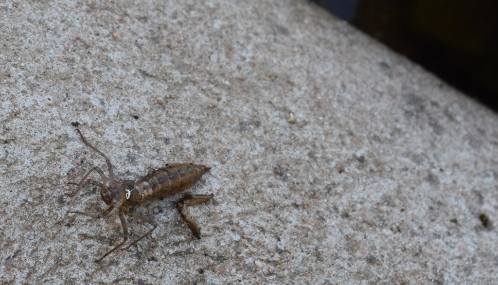 Thinking of dragonflies reminds me that Emily spotted their cast skins on the edge of the dipping pool. The larvae crawl out of the pond, shed their skins, wait for their new wings to expand, and fly away. The species can be identified by the skins (called exuviae) by an expert. Emily also spotted a common lizard in the garden one day. Maybe it was too cold to run away – she was able to pick it up and Joanna got a photograph. It’s good to think of that the frogs and toads in the garden (so many more since the dipping pool project) will be joined by lizards in the natural control of slugs.