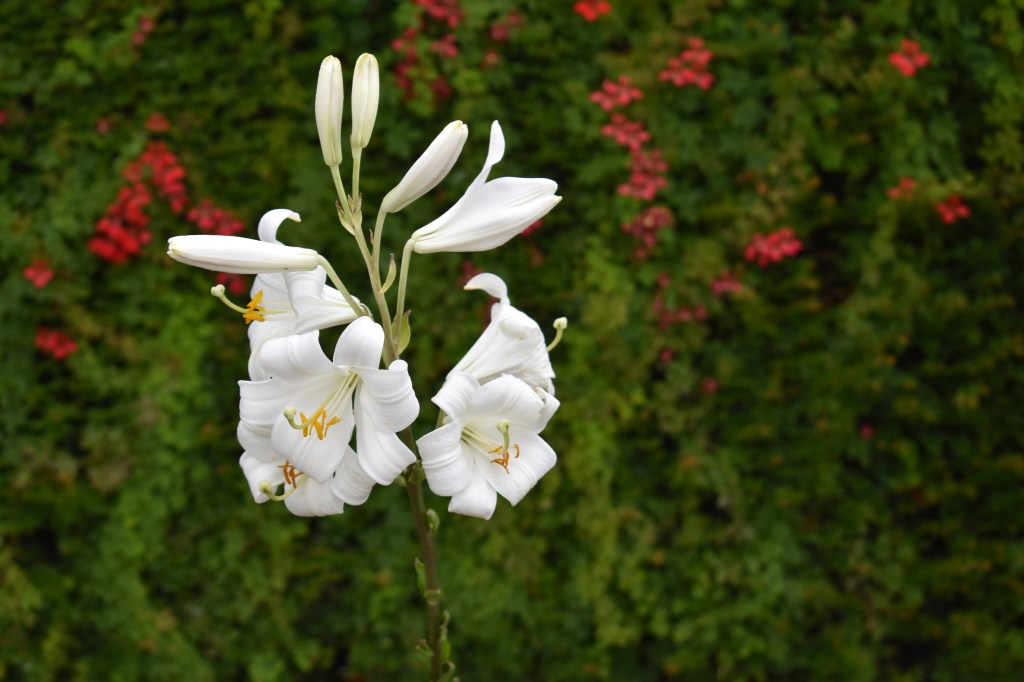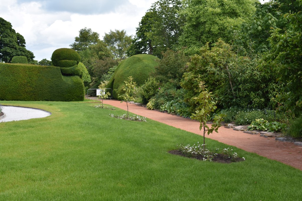 The three Portugal laurels which used to grace the lower end of the Rose Garden were removed partly by accident – a branch of the handkerchief tree fell and damaged one a few years ago – and partly by design because the middle one was only about 25 years old anyway and James felt that three laurels all of different ages would spoil the effect of the original design. Three cuttings which Joanna has been nurturing for about four years have now been planted and they will be clipped in recognition of the Victorian design. The three old laurels in the Fountain Garden which are fragile, with the trunks beginning to rot away, will also be replaced in time. The Madonna lilies on the west border of the Rose Garden are flowering well and will bulk up in the years to come. After the hard work, over more than three years, the gardeners can take pleasure in their achievements before the next project begins. Holidays are in prospect.