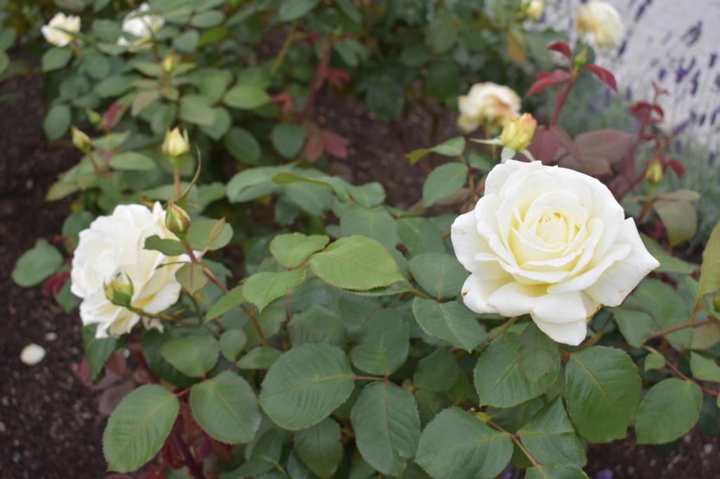 However, the sun shone on the opening day of the Rose Garden. I was away on holiday, but the gardeners report that the day went well. I could feel the relaxed mood when I visited a few days later. James felt as though a heavy load had been lifted from his shoulders; a deadline had been met and a project had been successfully finished. I say finished, but of course a garden is never finished – it’s always work in progress. The heavy rain prior to the opening tested the new drainage to the limit; the result was a resounding pass; none of the newly laid red blaze on the paths was washed away and I could see no damage to the flowers – a testament to strong healthily grown plants chosen for resilience and given time to settle in. I was particularly taken by the combination of the creamy white rose, ‘Memoire’ (also known as ‘Ice Cream’), with the white cosmos. The pink floribunda rose is called’ Valentine Heart’. As the climbing roses cover the arbours the garden will slowly ease into maturity.