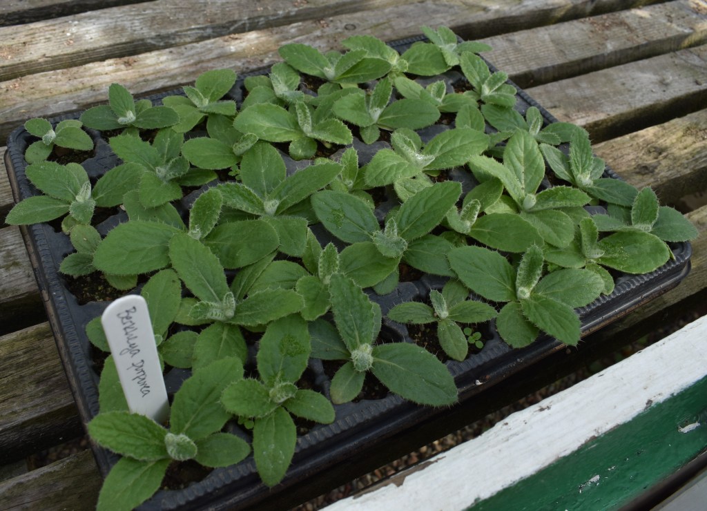 There is the usual mixed germination on the propagating bench (the white sweet peas never seem to do well) but the Berkheya purpurea from Crathes seed have excelled themselves. I think they are to go along the wall where the arbutus fell in Storm Arwen.
