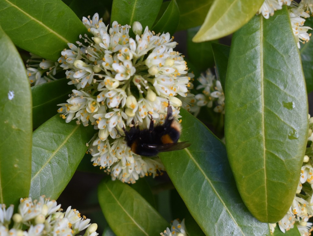 The Skimmia ‘Kew Green’ in the corner of the Fountain Garden is always attractive to insects and this year is no exception. It is covered in solitary bees. I am not an expert on solitary bees but it appears from an identification guide that it is Halictus rubicundus – a mining bee that is widespread in Scotland nesting in sunny banks.* There were bumble bees too on the skimmia but in less quantity