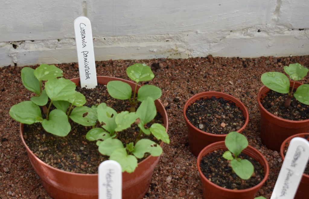 Plants are at the heart of the garden and learning plant names is ongoing for us all; sometime just reminding ourselves, sometimes having to learn completely new names. Glaucidium palmatum on the South Border was puzzling people at lunch break this week. Also known as the Japanese Wood Poppy, it belongs to the Ranunculaceae (buttercup) family. I forgot to go and look at it but find I have a photo taken in 2017. James and Joanna were recently in Fife buying new plants so there will be more challenges ahead; new varieties of meconopsis have been mentioned. Presently they are in the nursery in quarantine. Joanna has new seeds germinating in the glasshouse which I will have to learn. On googling Cussonia paniculata I am surprised to find it is a small tree native to South Africa. Considered to be a pachycaul (swollen stemmed) succulent, it will apparently store water in the swollen stem base which develops quite early in its growth. I imagine it is not expected to become a tree at Crathes, but just an interesting glasshouse plant. The seedlings look strong and healthy so I can follow its development. Will I remember its name?