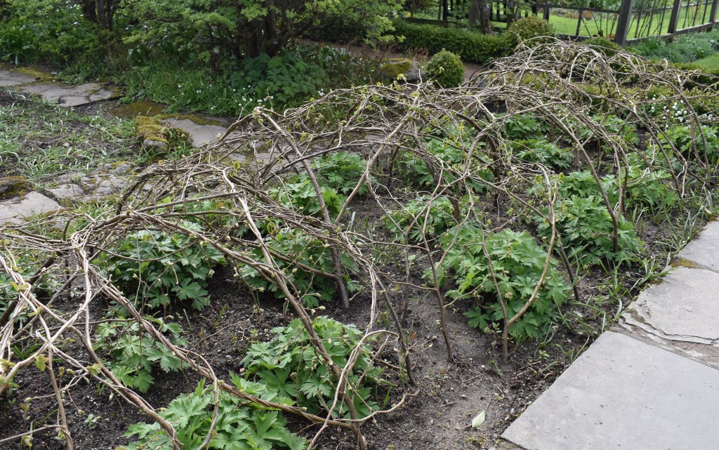 The Chusan palms, Trachycarpus fortunei, from the entrance area have been moved to the more sheltered Four Squares. Mike reports that they were difficult to move. After digging round the root ball it was winched from the ground, using the large Prunus serrula to take the strain, and wrapped in hessian before it was moved to the new site. Mike says he slept well that night. When I caught up with the gardeners Mike and Emily were moving red hot pokers, kniphofias, to be part of the display. Garden snails just love kniphofias; the leaves make good nurseries and perfect hiding places for snails to grow and multiply. We consider the hazel branch supports for the hardy geraniums and wonder if the Geranium psilostemon will manage to grow up through the twigs which are sprouting healthy hazel leaves and look ready to produce a thicket. Geranium psilostemon is a vigorous plant and might well come out tops.