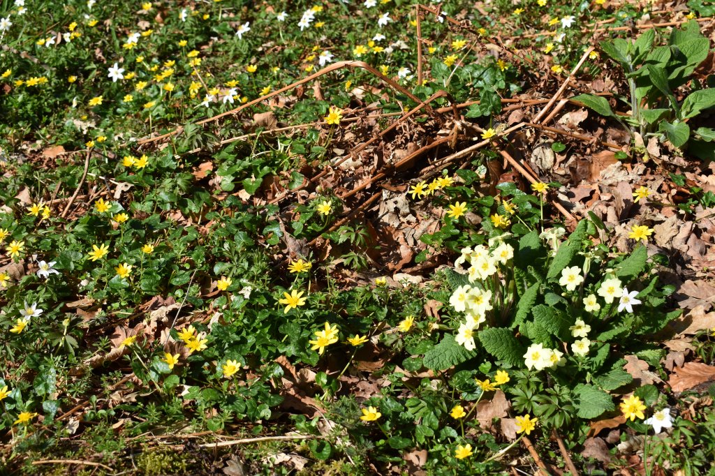 Such a good time of year, April, with all the summer ahead of us. Spring is certainly here but undecided as to whether to stay or not. Despite the cold winds and hail one or two days have been sitting out days; others not so seductive. Mid-April brought one day when the gloves and woolly hat could be cast aside. The celandines and wood anemones were scattering their gold and white charm across the native woodland area with clumps of paler primroses adding a little magic.