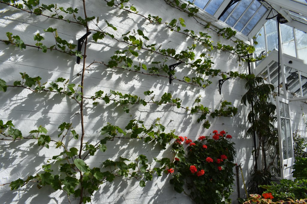 Maintenance continues in the glasshouses with glasshouse one still waiting for its staging and some more repair work. The old water tank will be refilled because the large volume of water helps to stabilise the temperature, rather like a storage heater. Because of the maintenance work the glasshouses are not open, though full of plants ready for the season. The vinery looks good with its pelargoniums and the new vine trained for display rather than for fruit.