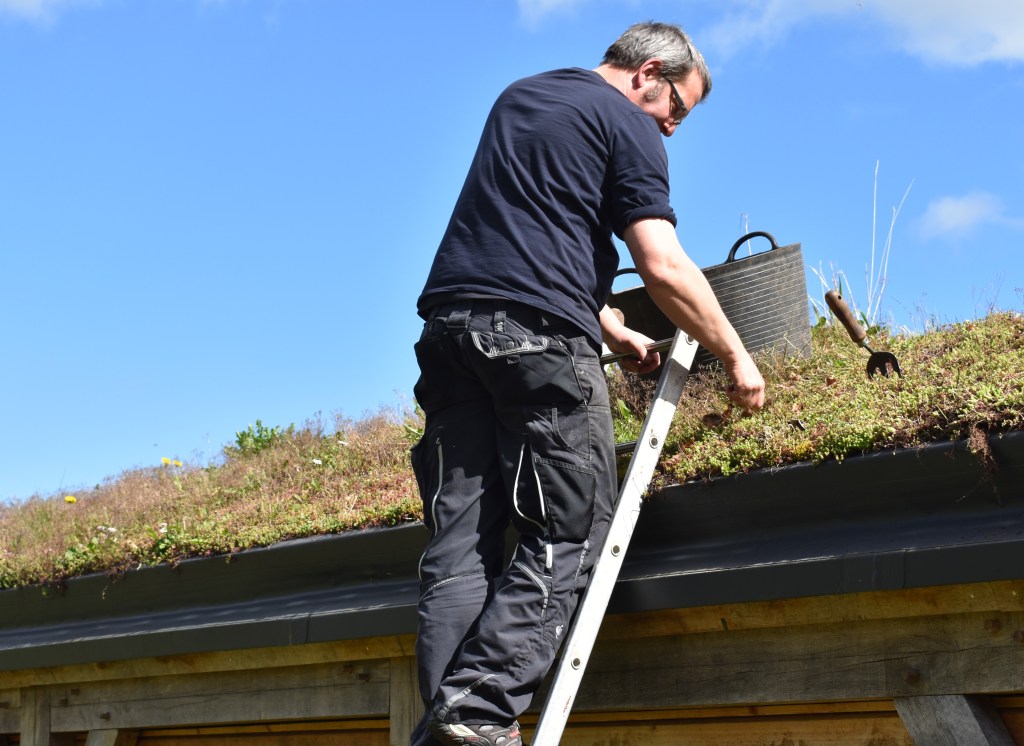 James has been weeding the roof of the entrance building. The dandelions like it up there, but for the meantime they are not welcome.