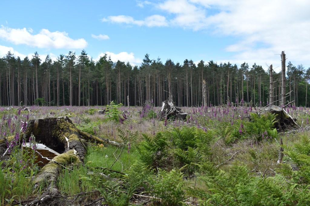 Wild raspberries and foxgloves are pioneers where trees have been felled after storms, 20 June 2024.