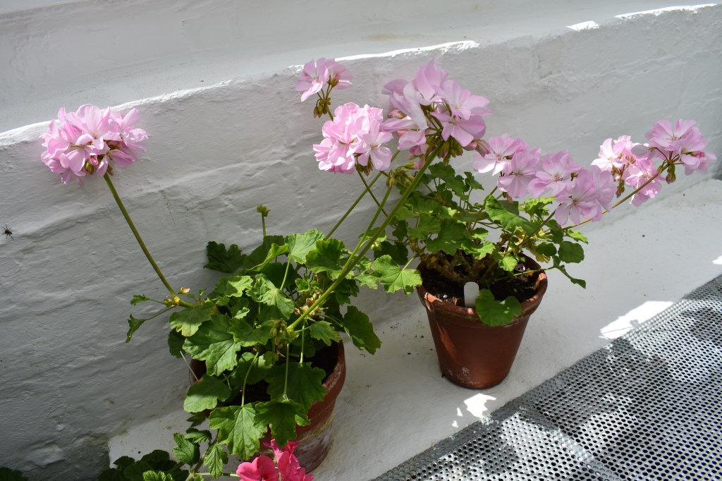 I am taken by this lovely pale pink pelargonium ‘Memories’, enhanced by the white walls and terracotta pots, 20 June 2024.