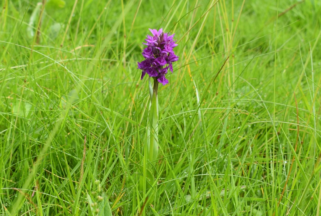 We have been on another jaunt, this time to Ullapool on the west coast. Ullapool is now part of the NC500 (North Coast 500). The town has changed from its original purpose, of fishing (a few fishing boats remain), to tourism with motor homes and cruise ships now bringing challenges and opportunities. The weather in the first week of June was abyssmal: cold and wet. Whatever the weather there are always plants to seek out. The native sanicle, Sanicula europaea, grew beside the riverside walks. Sanicle is a member of the apiaceae or carrot family (umbelliferae). Locally common throughout the British Isles, it is only occasional in Aberdeenshire and it is a while since I have seen it. Viburnum opulus also grew beside the river. Although I could not be sure if it had been planted it is another native that is only occasional in Aberdeenshire; I don’t think I have ever seen it growing wild in Scotland. We have a few cultivars of Viburnum opulus at Crathes – all planted for their attractive flowers and berries. I looked wistfully at the Ullapool front gardens where orchids grew in the grass that had been left uncut. Imagine, then, my surprise on returning from the week away to find that my own front garden, also left uncut, now sported a northern marsh orchid of its own.