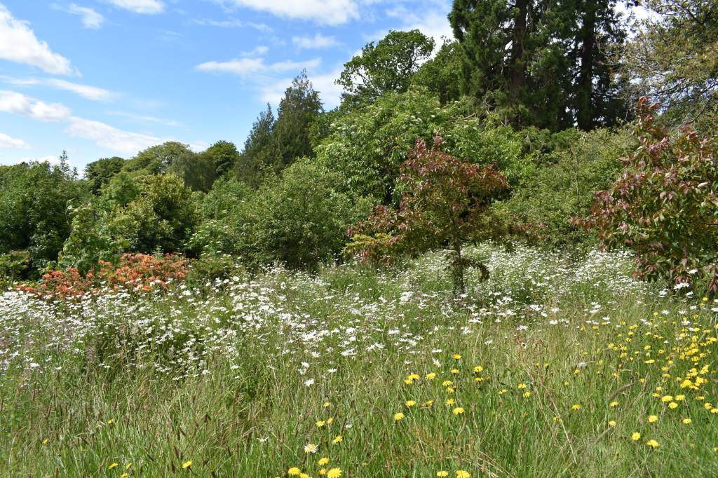 Up by the viewpoint another spectacle: a waving ‘sea’ of pink Yorkshire fog grass (Holcus lanatus) with a background of white ox-eyed daisies. But this meadow did not come by itself. Ten years ago the viewpoint was covered with rhododendrons – mostly, as I remember, of the invasive ponticum species. After clearance the area was planted up with shrubs such as viburnums, witch hazels, crab apples, even a monkey puzzle. Foxgloves invaded, but also rank docks and grasses and less welcome ‘weeds’. By dint of careful weeding, seeding, and removal of all the herbage after the meadow had shed its seeds, we have the result we see today. Yellow rattle is important in the mix as it parasitises the rank grass roots. Some meadows come naturally so long as the grass is not cut and pesticides and herbicides are banned, but there is no guarantee of success. The meadow above the viewpoint will continue to evolve but will always need some management and gardening time. It is particularly important to remove the considerable amount of herbage each autumn to keep the soil deplete of nutrition so that the wild flowers can flourish.