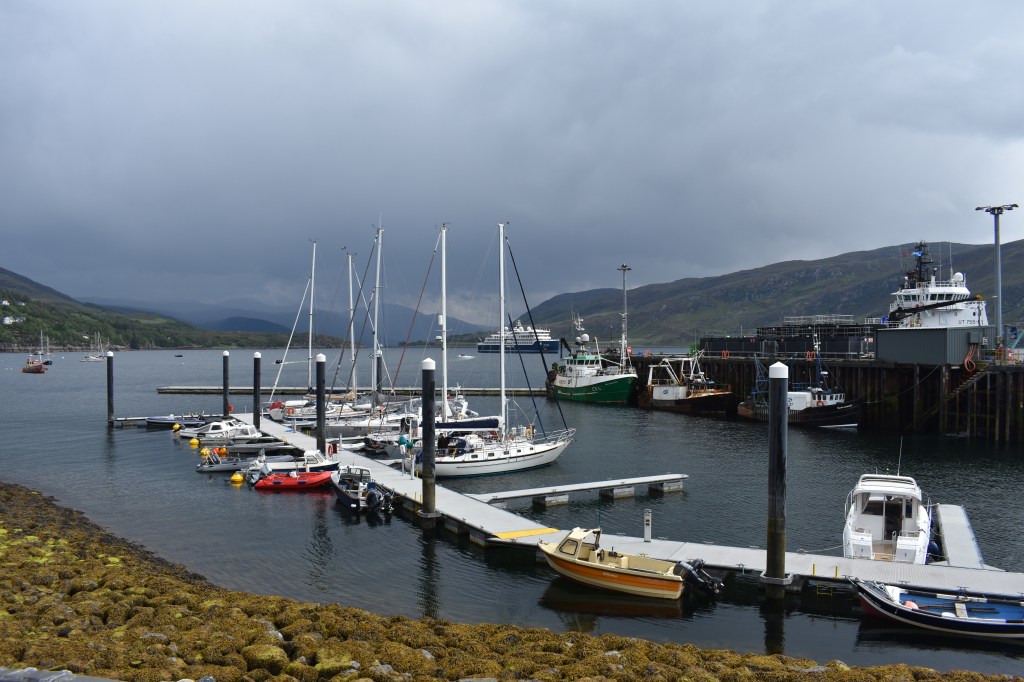 Yachts, fishing boats and a cruise ship show the modern Ullapool, 7 June 2024.